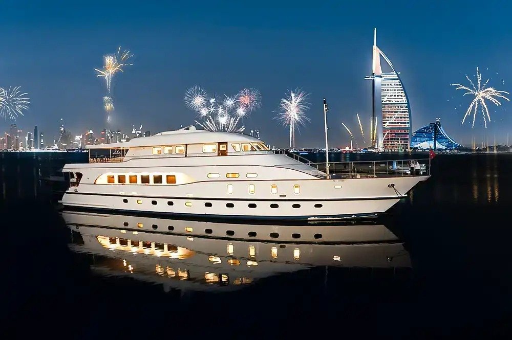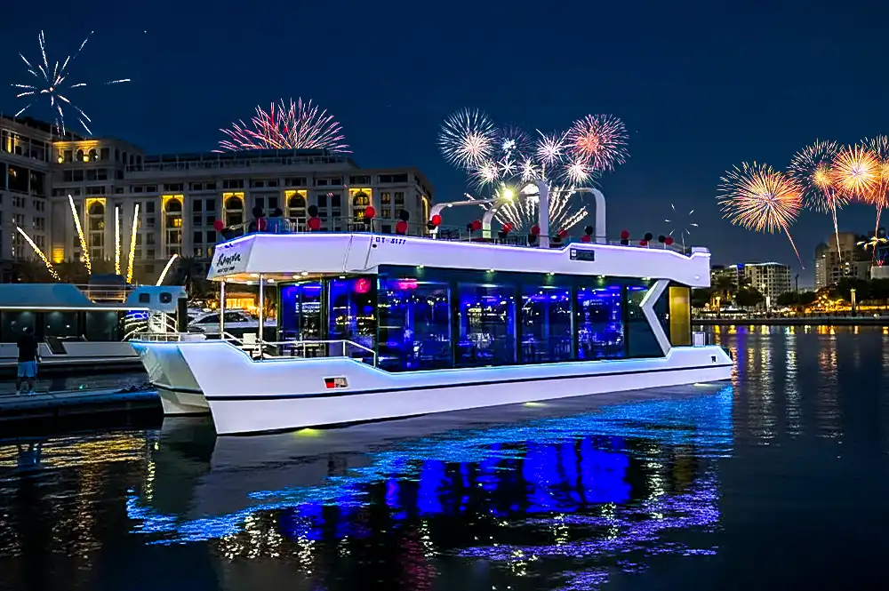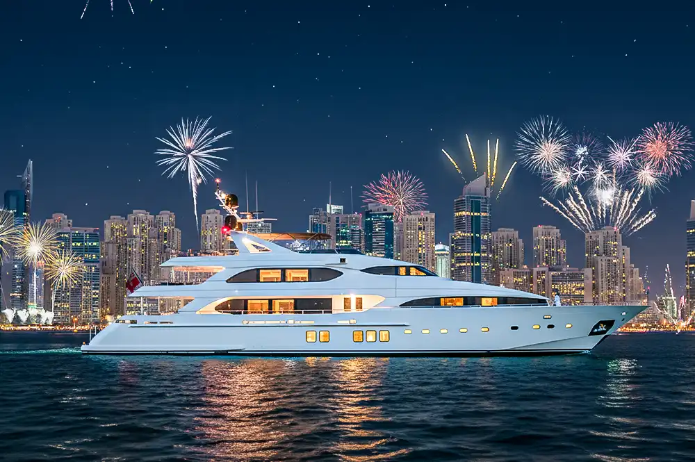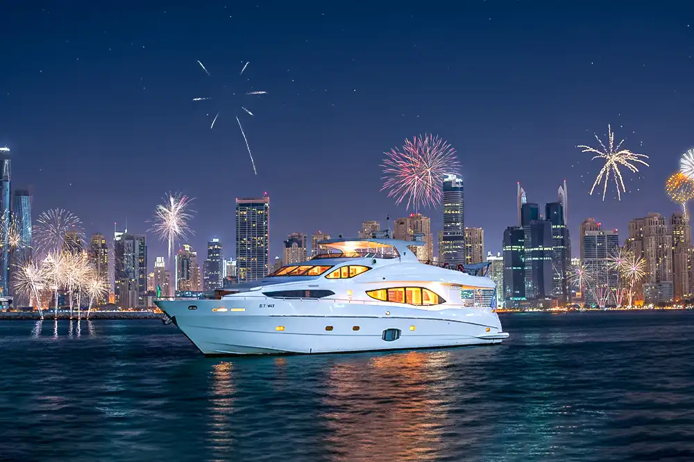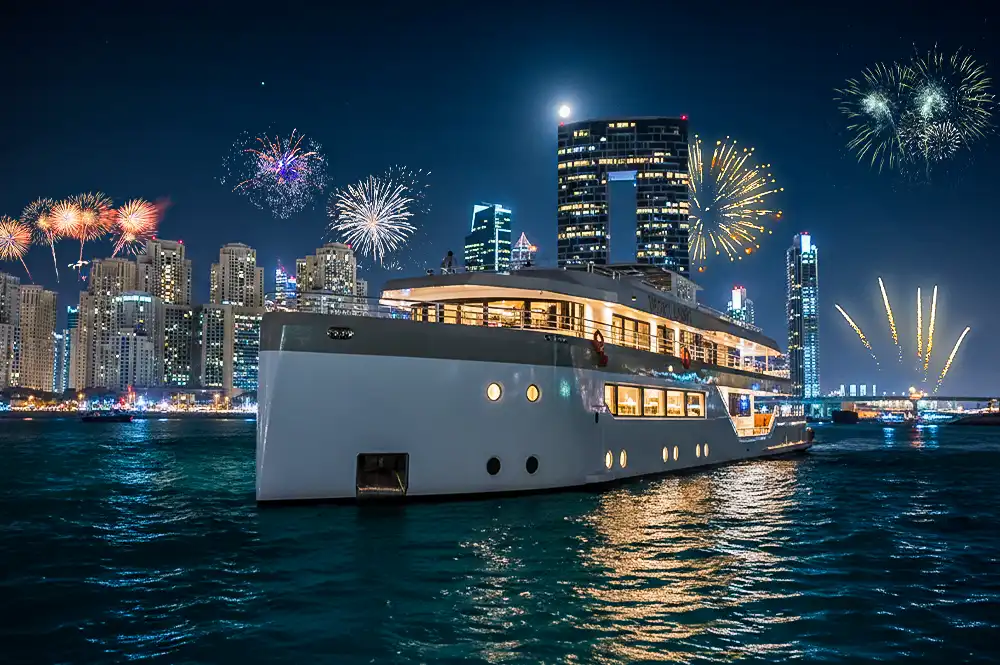 Spend the 31st of December 2026 in Dubai with our exclusive New Year Yacht Party and Mega Yacht Party. A complete 4-5 hours luxurious yachting experience with welcome drinks and fruit champagne, sounds fun right? However, things even get better with the lavish buffet dinner served to the guests. In addition, the soothing background music makes everything perfect. Furthermore, the Robo Chef, unlimited premium beverages at the open bar, live entertainment, and DJ at the Mega Yacht Party are something to relish. Anyone booking the New Year Yacht party can play their choice of music. In addition, take full advantage of the luxe open deck to witness glamorous fireworks across Bluewater, Palm Jumeirah, Atlantis, Burj Al Arab, JBR, and Dubai Marina from both yacht parties.