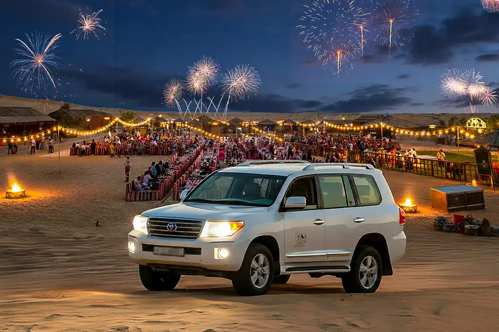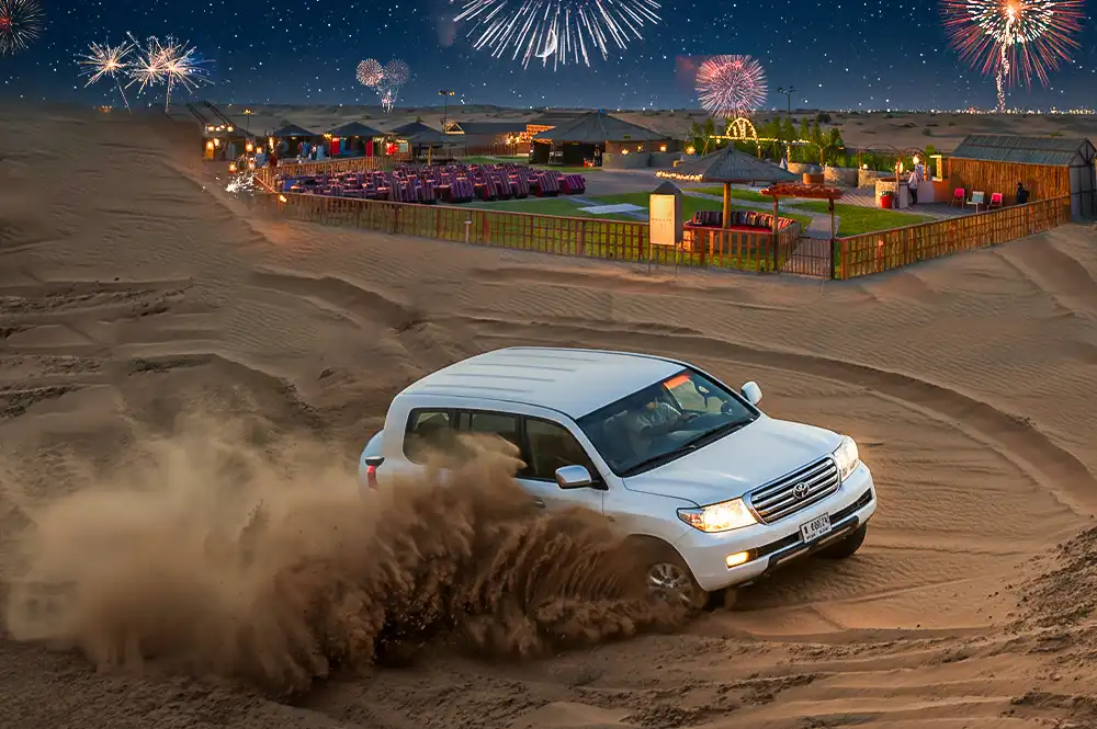 Escape from the New Year rush in the city and run to the Dubai Desert on 31st December evening. Choose from the overnight desert safari or late-night New Year Party in the Dubai desert for an extraordinary celebration. BBQ dinner, local delicacies for snacks, traditional performances (belly dance, Tanoura dance, and live fire show) for entertainment, and dune bashing- what else can you think of for a perfect New Year’s Eve celebration? Miscellaneous activities include camel riding, photography wearing Arabian outfits, and much more. Okay, the only difference is with the overnight desert safari, you will spend the night in the desert and begin the 1st of January 2026 by enjoying a breathtaking desert sunrise and a fulfilling breakfast.