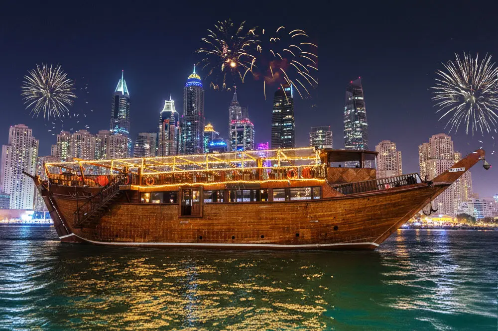 Do you want to try something premium? Well, the best you can do is book Dubai’s premium or VIP dhow cruise experiences. Although the inclusions remain the same, what changes is the dinner and extra services for the guests. Along with the live entertainment, DJ, and good food, you can also enjoy alcoholic beverages from the open bar with the New Year VIP Dhow Cruise. Besides, there is an additional cake-cutting ceremony on both cruises to rejoice and welcome New Year 2026. The VIP Dhow Cruise will let you enjoy fireworks over Atlantis, JBR, and Ain Dubai. However, premium dhow cruise marina lets you marvel at New Year fireworks over Atlantis, Palm Jumeirah, Burj Al Arab, JBR, Ain Dubai, and Marina.