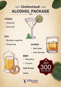 We don’t offer alcohol with the package. However, you can buy it separately to enjoy the drinks.