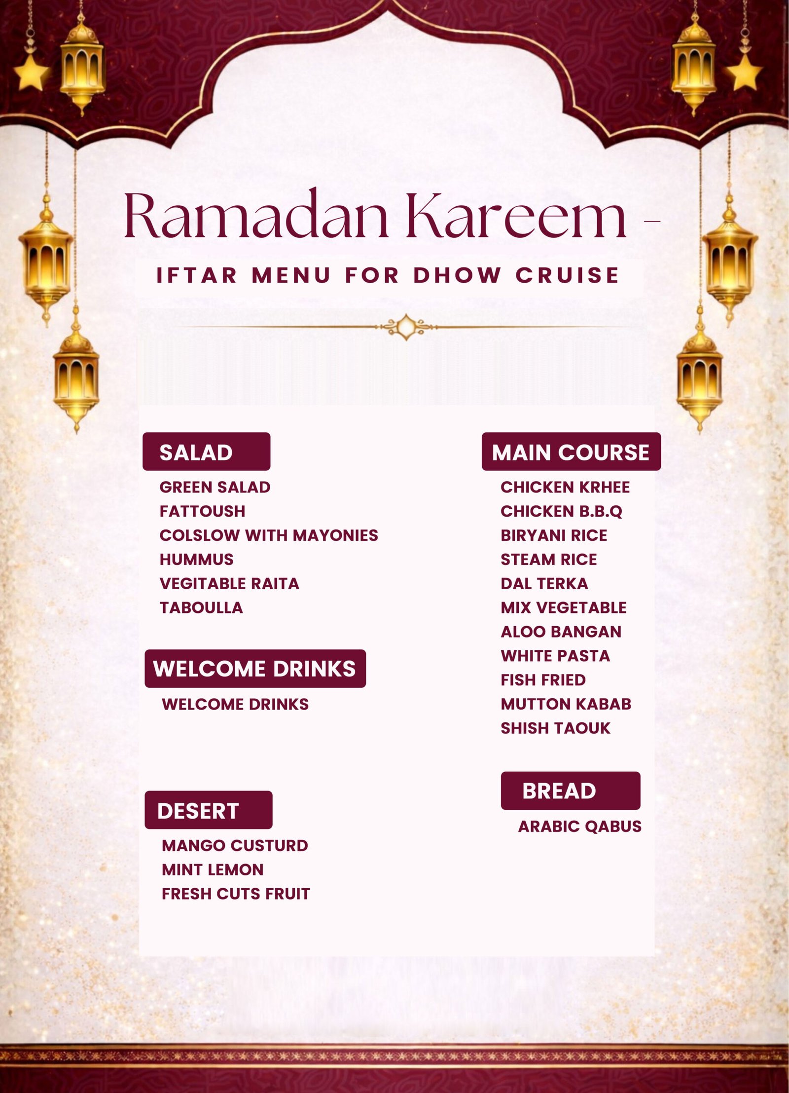 A dhow cruise during Ramadan is more than just dinner — it is a cultural journey through Dubai’s heritage. Enjoy delicious food, live entertainment, and breathtaking waterfront views while celebrating the holy month in a peaceful and elegant setting.
